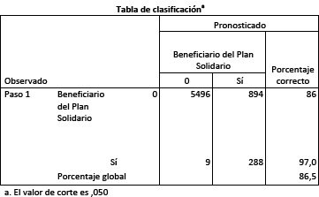 Hemos de probar con diferentes variables hasta dar con un modelo que ajuste adecuadamente. Es decir, que prediga razonablemente la condición de los hogares beneficiarios. Que los estados pronosticados coincidan lo más posible con los reales.