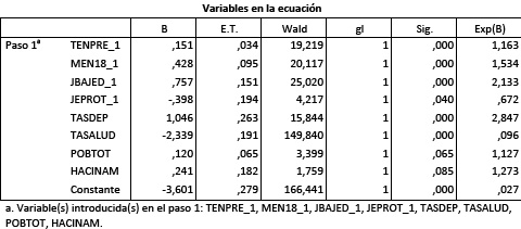 Todas ellas se muestran significativas a través del estadístico de Wald: prueba de significación cuya hipótesis nula es que los coeficientes B de la regresión logística son iguales a cero (Hosmer y Lemeshow, 2000). En todos los casos es posible rechazar esta hipótesis nula con una probabilidad de error siempre menor a 10% (8,5% en el caso del hacinamiento).