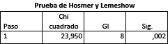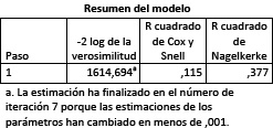 En la siguiente tabla (prueba ómnibus sobre los coeficientes del modelo) se muestra una prueba Chi Cuadrado que evalúa la hipótesis nula de que los coeficientes B de todas las variables introducidas, a excepción de la constante, son cero. Este estadístico está obtenido por diferencia entre los valores del – 2LL antes y luego de la introducción de las variables independientes. La significación de Chi cuadrado (menor a 0,001) nos permite rechazar tal hipótesis nula sin vacilación alguna.