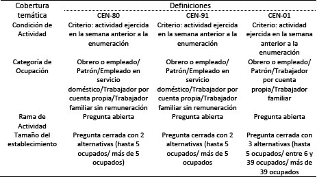 En todos los censos modernos (exceptuado el de 1947) la conceptualización de las variables económicas siguió el enfoque de fuerza de trabajo, que sugiere el registro de la ocupación ‘actual’ en un periodo breve y reciente, en lugar de la “ocupación habitual” como lo hacía en su momento la propuesta del trabajador remunerado. Todos los censos bajo análisis tuvieron la misma definición de “hogar” y la identificación del miembro del hogar fue de facto en los tres. En términos generales, los datos disponibles respecto de la unidad de observación son razonablemente aceptables y comparables.