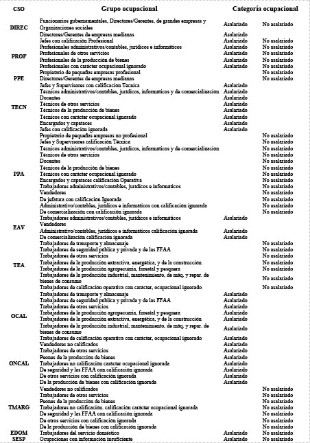 La homologación categorías de CSO fue realizada a nivel agregado según categoría ocupacional. Para ello se tuvo en cuenta la definición conceptuales de las categorías del CNO y también las posibilidades de comparabilidad de los códigos del CNO-91 y el instrumento utilizado en el CEN-80 (INDEC, 1997: 237-252). Las asignaciones fueron realizadas de acuerdo a el Esquema 1, para 1991 y de acuerdo al Esquema 2 para 2001.