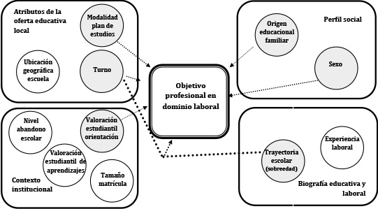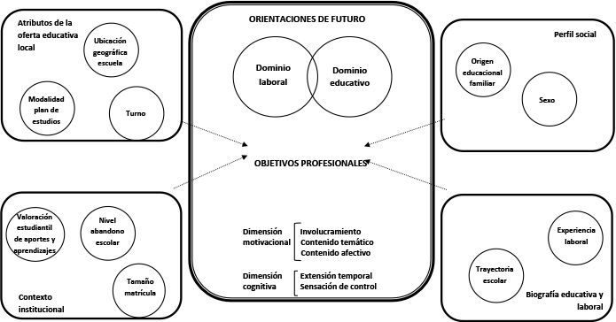 En el Diagrama 1 se presenta el modelo analítico completo: el concepto orientaciones de futuro y cuatro dimensiones o grupos de variables explicativas introducidas en la regresión logística sobre los objetivos profesionales.