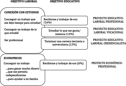 Dada la centralidad cobrada por los proyectos educativo-laborales (Guichard, 1995) se profundizó acerca de las conexiones entre los dominios laboral y educativo de las orientaciones de futuro. Fue así como se elaboró una tipología en base a las convergencias halladas entre los objetivos laborales y educativos de los estudiantes, quedando definidos los siguientes tipos (ver el diagrama 2): a) proyectos educativo-laborales profesionales (24% de los estudiantes); b) proyectos educativo-laborales vocacionales (13%); c) proyectos educativo-laborales credencialistas (12%) y d) proyectos económico-profesionales (6%). Más de la mitad de los estudiantes quedó comprendida en alguno de estos enlaces cuyo denominador común era un itinerario futuro de profesionalización, aunque con dinámicas distintas en cuanto a la estructuración temporal y la anticipación de posibles obstáculos.