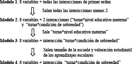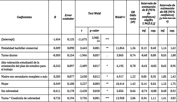 En cuanto a los signos negativos que presentan las variables turno y sobreedad, estos se deben a la presencia de la interacción entre ambas en el modelo final. Siguiendo a Heeringa, West y Berglund (2010) en el desarrollo de las razones de odds para el análisis de las interacciones en los modelos de regresión logística, se interpretó la incidencia combinada del turno y la sobreedad, (