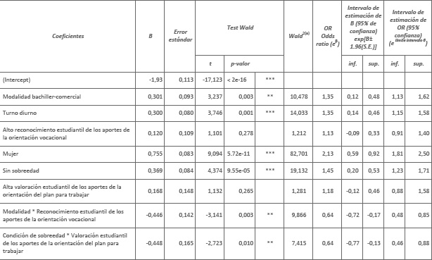 La salida de la regresión final se presenta en el Cuadro 3. Se observó una fuerte incidencia de la variable sexo en los objetivos profesionales, y en segundo orden de importancia, del turno y de dos interacciones: “modalidad* reconocimiento estudiantil de la orientación vocacional” y “sobreedad*valoración estudiantil de la orientación para la inserción laboral”. Los resultados indican una fuerte incidencia de la variable sexo en los planes de estudio profesionales, con un β4 =  0,755. Es así como las chances de optar por este tipo de planes se duplican entre las mujeres con respecto a los varones (