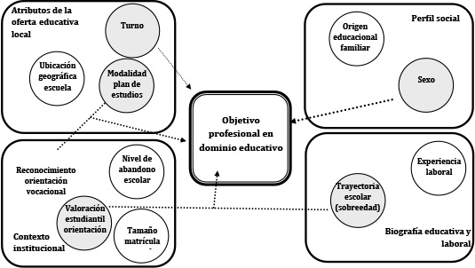 La prevalencia empírica y la relevancia teórica de los objetivos de tipo profesional llevaron a emprender el desafío de identificar los distintos aspectos que podían explicar estas preferencias. Para ello se utilizó un modelo de análisis multivariado sobre los objetivos profesionales. Siguiendo el modelo analítico presentado en la sección 2, se consideraron cuatro dimensiones explicativas: contextual, institucional, social y biográfica. Dado que en general los estudiantes habían previsto menos condicionamientos educativos que laborales -quedando sugeridas distintas estructuraciones de los espacios de posibilidad imaginados-, en esta instancia se consideró pertinente analizar por separado cada plano de futuro.