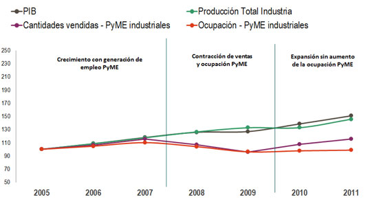 El Gráfico 1 presenta la evolución de las cantidades vendidas por las PyME industriales entre 2005 y 2011 en relación al comportamiento del nivel de actividad del total del sector industrial (medido a través del EMI) y del PIB, distinguiendo en tres etapas bien marcadas para las PyME: crecimiento con generación de empleo (2005-2007, aunque había iniciado dos años antes); contracción de ventas y ocupación (2008-2009) y expansión sin aumento de la ocupación (2010-2011).