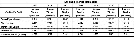 Pero al analizar la asociación de la eficiencia en la producción de las PyME industriales argentinas con su sector de actividad de pertenencia de acuerdo al contenido tecnológico, tampoco se encuentran diferencias significativas. Con lo cual, los resultados no permiten confirmar que haya sectores de actividad más eficientes en su producción que otros, dada su dotación de factores de producción.