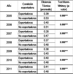 Tabla 7: Nivel de Eficiencia Técnica promedio de las PyME industriales argentinas, por condición exportadora y año, bajo RVE. Test de Mann-Whitney