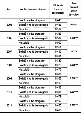 Cuando se analiza el nivel de eficiencia de las firmas que solicitan y obtienen créditos bancarios, respecto a las que encuentran rechazadas las solicitudes, e incluso en relación a aquellas que directamente no efectúan solicitudes, no se observa una tendencia clara (Tabla 10), sino que los resultados son volátiles.