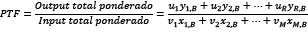 La productividad total de los factores (PTF) mide eficiencia técnica en la producción de una firma (capacidad de una empresa de hacer un buen uso de sus factores productivos para lograr el máximo de producción posible), y es una medida más completa del desempeño relativo de una empresa que la productividad parcial, que se limita a un solo factor de producción (como puede ser la productividad laboral). A partir de la PTF la eficiencia resulta expresada como el cociente entre la suma de productos ponderada y la suma de los insumos/factores productivos ponderada. Por ejemplo, para la firma “B,” la PTF se mediría de la siguiente manera:
