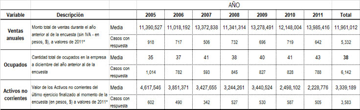 Para hacer este análisis se descartaron las empresas para las que no se dispone de información completa en todas las variables utilizadas para aplicar el DEA, lo que varía año a año. La Tabla 1 presenta el valor medio y la cantidad de registros de empresas con información sobre cada una de las variables a partir de la base disponible de la EE para cada uno de los años bajo análisis32.