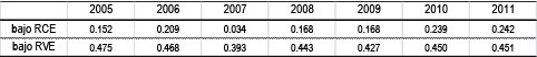 Tabla A1: Resultado de Prueba t por pares para evaluar diferencia de medias del nivel de Eficiencia Técnica bajo RCE y bajo RVE, por año (p-valor del test).