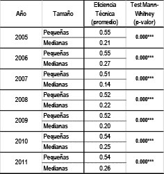 Tabla 3: Nivel de Eficiencia Técnica promedio de las PyME industriales argentinas, por tamaño y año, bajo RVE. Test de Mann-Whitney