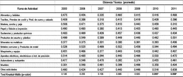 Tabla 5: Nivel de Eficiencia Técnica promedio de las PyME industriales argentinas, por rama de actividad y año, bajo RVE. Test de Kruskal-Wallis
