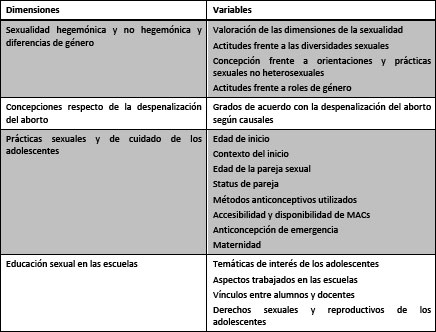 Enmarcado en una investigación sobre salud sexual y reproductiva, educación sexual y los vínculos entre actores escolares, se realizó durante el segundo semestre del 2012 un relevamiento por encuestas a mujeres y varones de escuelas medias de Argentina que abordó las siguientes dimensiones:2
