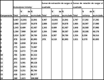En el Cuadro 1 presentamos el método de extracción de factores resultante de la aplicación del ACP al relevamiento a alumnos, en el cual es posible observar en la primera columna el número total de variables intervinientes, y en la segunda los autovalores obtenidos para cada uno de ellos. Esta última columna nos presenta un indicador que nos permite tener una medida para tomar decisiones en torno a cuales componentes seleccionar y cuales rechazar. En general, se busca desechar aquellos componentes con autovalores inferiores a la varianza media, que en el caso de trabajar con matrices de correlación, adquiere el valor de 1 (Peña, 2002). Empleamos dicho criterio para la selección de los componentes en el presente trabajo.