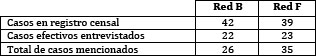 La Tabla N° 1 muestra los casos relevados en las dos redes, diferenciando la totalidad de casos que conformaban la base censal de beneficiarios de los casos efectivos que fueron entrevistados, así como de los casos que fueron mencionados, entre los cuales se incluye a los que pudieron ser nombrados pese a no haber sido entrevistados.