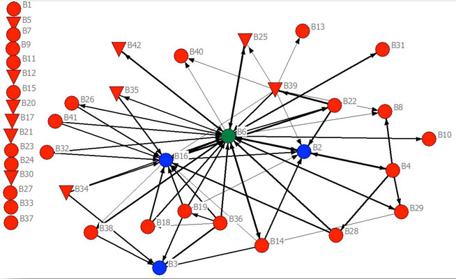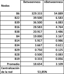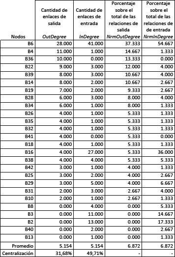 Al analizar los valores del grado normalizado (nrmDegree), se observa que el nodo B6 se encuentra altamente conectado, tanto en los valores de salida como de entrada (37,3% y 54,6%). Además, cabe destacar que el nodo B16 registró un valor alto (36%), muy por encima del promedio, para los valores normalizados de entrada, mientras que el resto de los referentes (nodos B2 y B3) registraron porcentajes de menor magnitud (17,3% y 14,6% respectivamente) en cuanto al porcentaje de conexión (NrmInDegree).