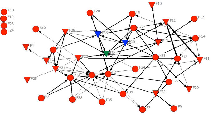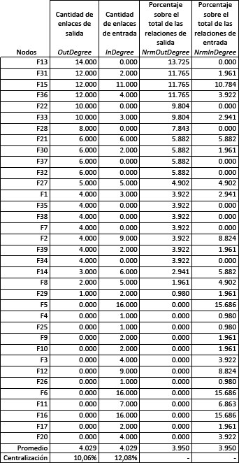 Los nodos F13, F31, F15, F36, F22, F33, F28, F21 y F30 son los que tienen grado de salida mayor al promedio, y por ello son los más influyentes. Sólo el nodo F15 fue caracterizado como miembro de la organización, mientras que a él se le suman los nodos F6 y F16 como los que registraron valores (de entrada) por encima de un solo dígito. De ellos, el F15 y F6 forman parte de la organización, lo que los ubica en una posición de influencia por sobre el resto, siendo el nodo F15 es el que registró mayor cantidad de enlaces (salida y de entrada).