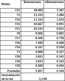 En cuanto a la centralidad de intermediación de la Red F (Tabla N° 8), la misma es notablemente más baja que la Red B (3,1%), lo que indica que la Red F en su conjunto no posee estructuralmente demasiado poder de intermediación. Si analizamos individualmente a los nodos, puede notarse como el F15 es el que mayor poder de intermediación obtuvo si se lo compara con el resto. Dicho nodo es parte de la organización, mas no fue señalado como el referente máximo por los demás entrevistados. Si analizamos individualmente a los nodos, puede notarse como el F15 es el que mayor poder de intermediación obtuvo si se lo compara con el resto. Dicho nodo es parte de la organización, mas no fue señalado como el referente máximo por los demás entrevistados. Otro nodo que puede caracterizarse como influyente, y que forma parte de la organización, aunque en menor medida, es el F36. El resto de los actores que registraron valores de intermediación e intermediación normalizada por encima de sus respectivos promedios fueron los nodos F2, F33, F31, F21, F8, F27, F14 y F1. En términos comparativos, la Red F presenta un poder de influencia de intermediación marcadamente menor que la Red B, en la cual se observó un nodo particular (B6) con un alto grado de influencia en este tópico por sobre los demás.