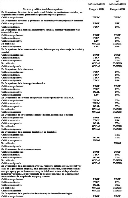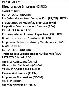 El trabajo está basado, en parte, en la Tesis de Maestría en Generación y Análisis de Información Estadística de la Universidad Nacional de Tres de Febrero titulada “Reconstrucción de la serie del nomenclador de Condición Socio-Ocupacional para los censos de 1991, 2001 y la Encuesta Permanente de Hogares” dirigida por Susana Torrado y Mabel Ariño2.