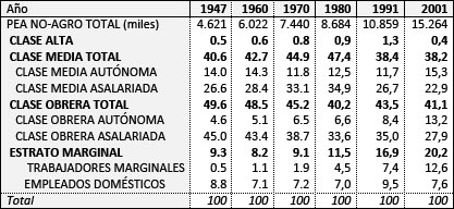 Los datos obtenidos de acuerdo a la metodología de reconstrucción y ajuste de datos propuesta permitieron reconstruir la serie desde 1947, que se muestran en la Tabla 1. Las tendencias a largo plazo de la estructura social global pueden resumirse de la siguiente manera: clase alta numéricamente pequeña, progresiva desalarización de la clase media, acentuación de la desalarización de la clase obrera, alto aumento del estrato marginal.